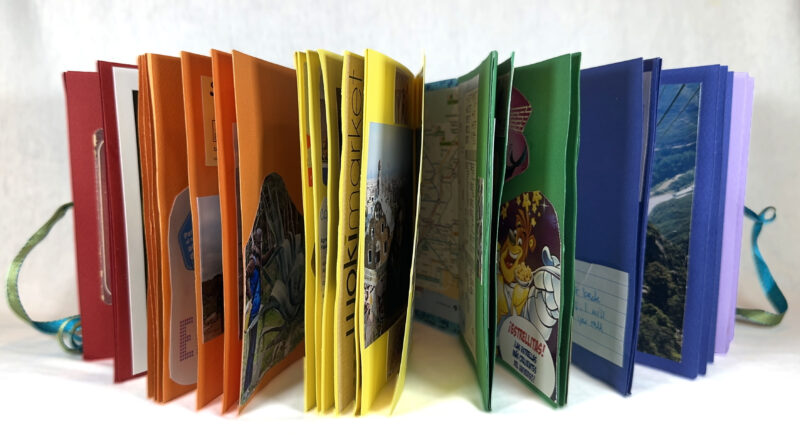 España with Suzanne is a colorful, handmade accordion book that includes photos and ephemera from the artist’s 2009 trip to Spain with the eponymous Suzanne and both of their mothers.